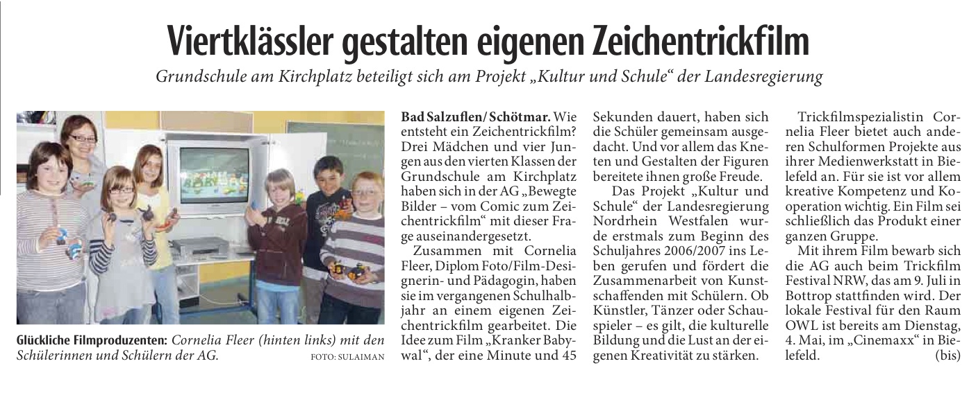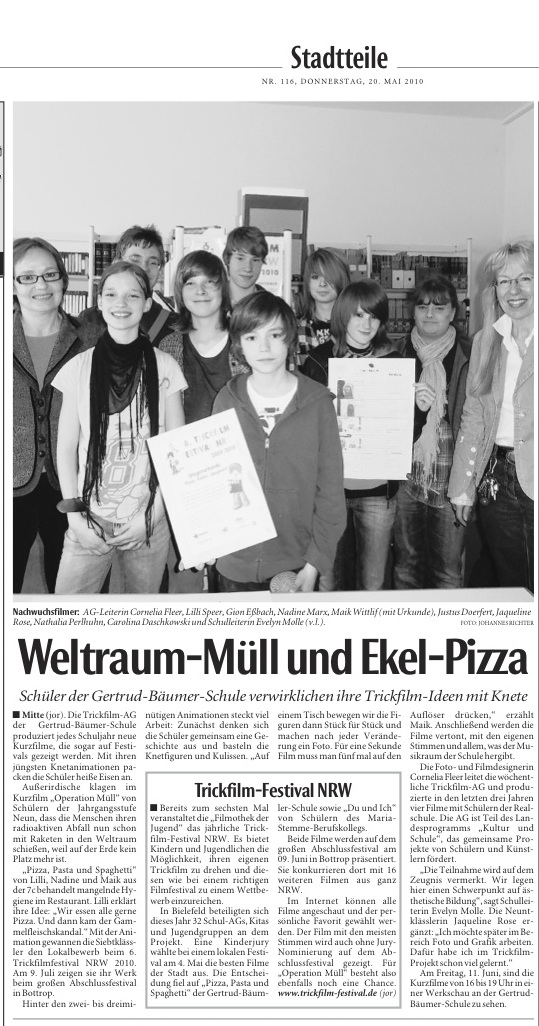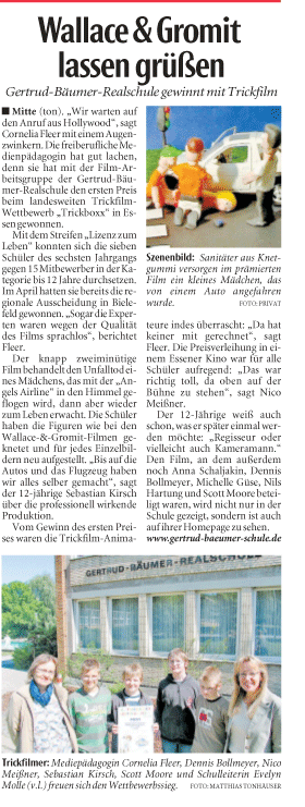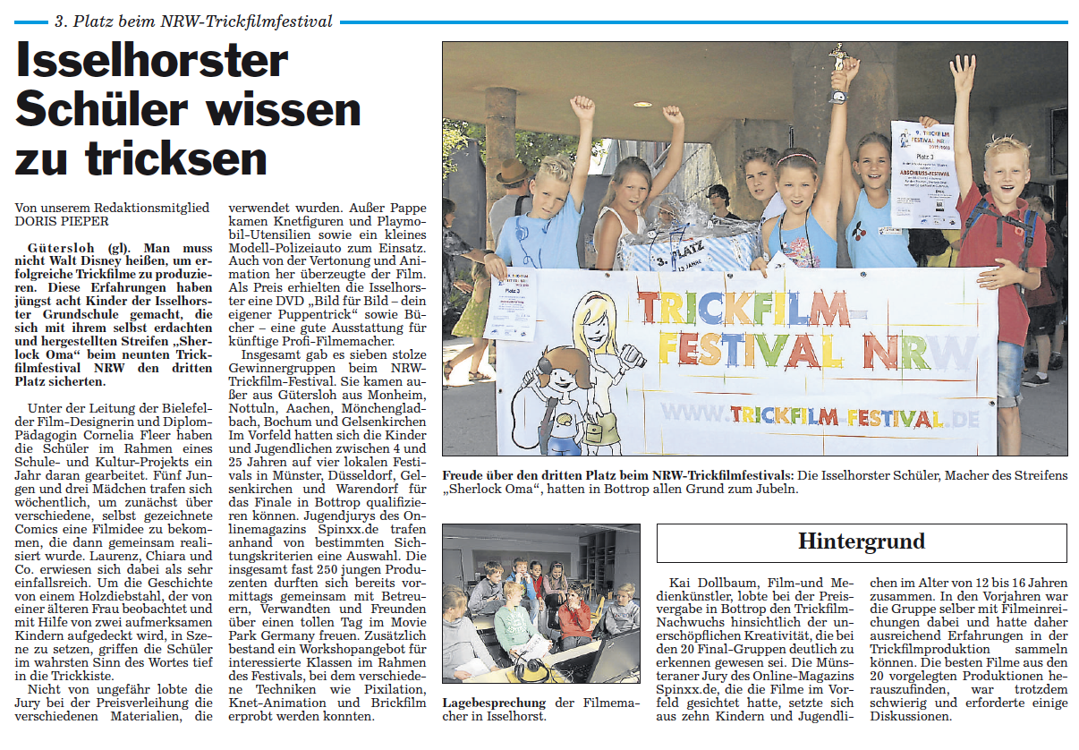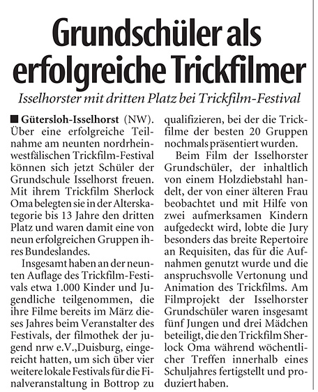 "Unter die besten drei Filme hat es auch "Sherlock Oma" geschafft. Durch sehr gute Vertonung, Kulissen und Animationen ist er besonders aufgefallen. Interssant war außerdem die Darstellung durch verschieden Materialien wie Knete und Papier. Sehr kreativ fanden wir auch den Gesang am Ende des Films, der das Ende nicht so abrupt wirken ließ.